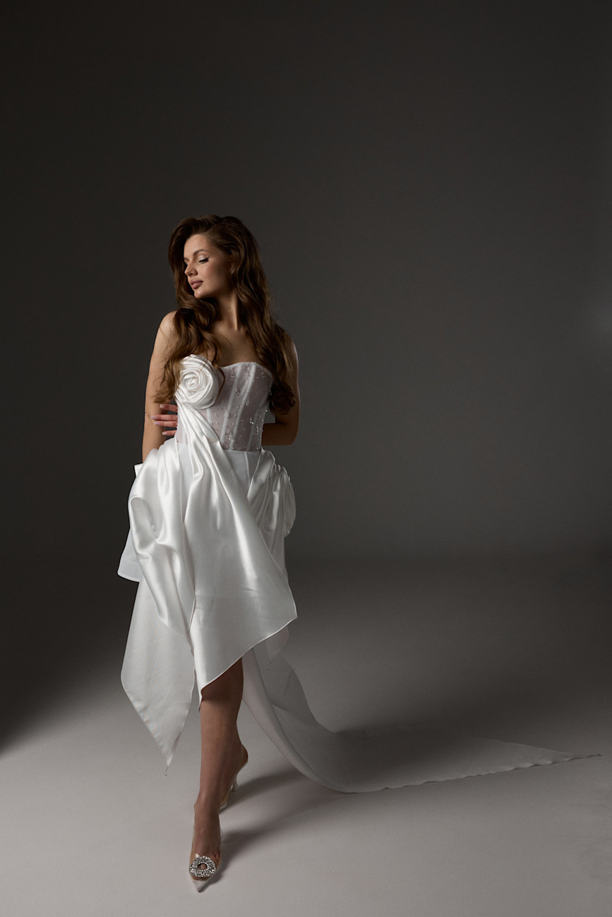 В нежнейшем кофейном оттенке,выполнено из блестящей ткани со светоотражающими частицами!Идеальный корсет и съёмные рукава.