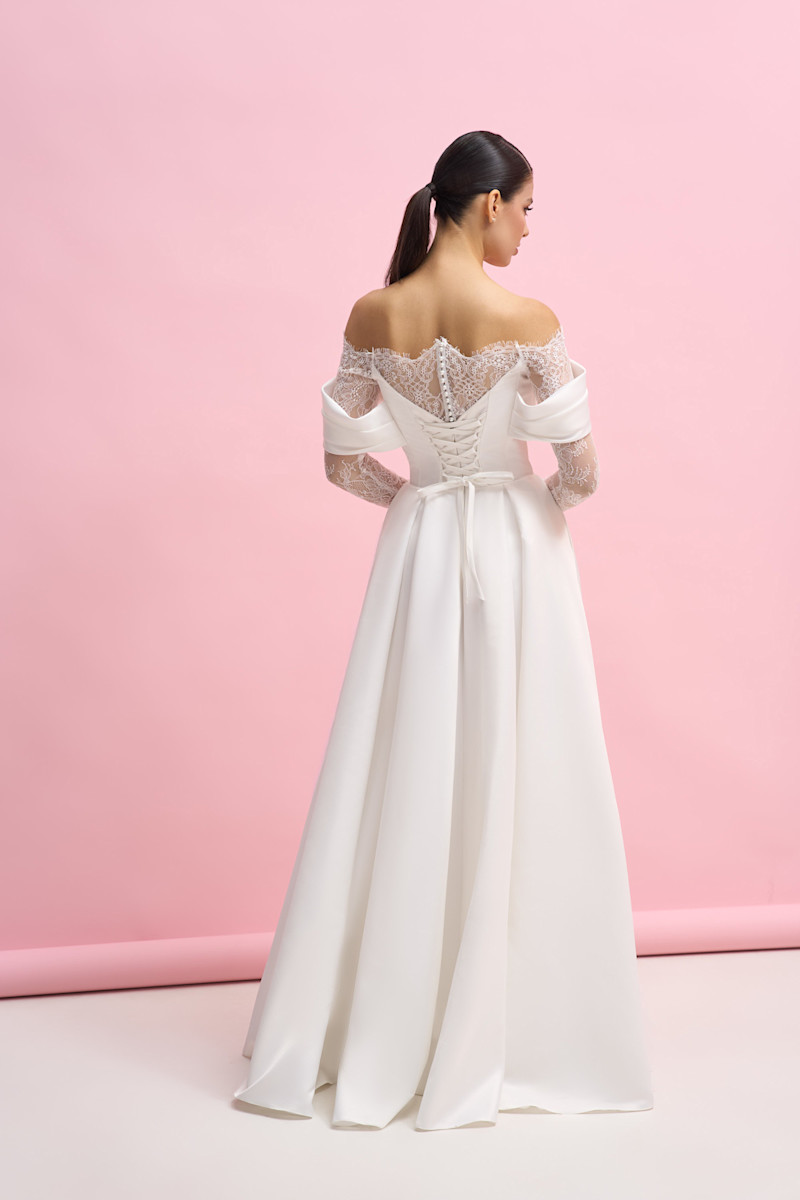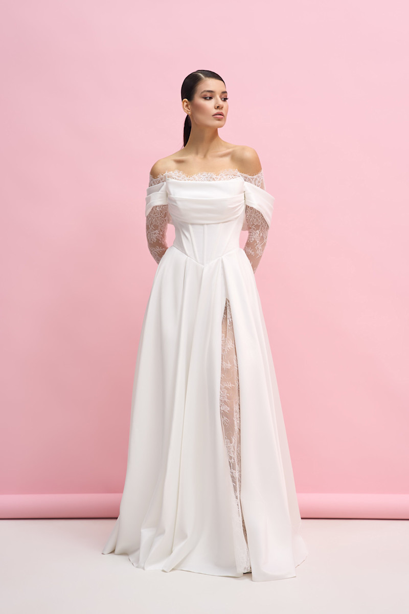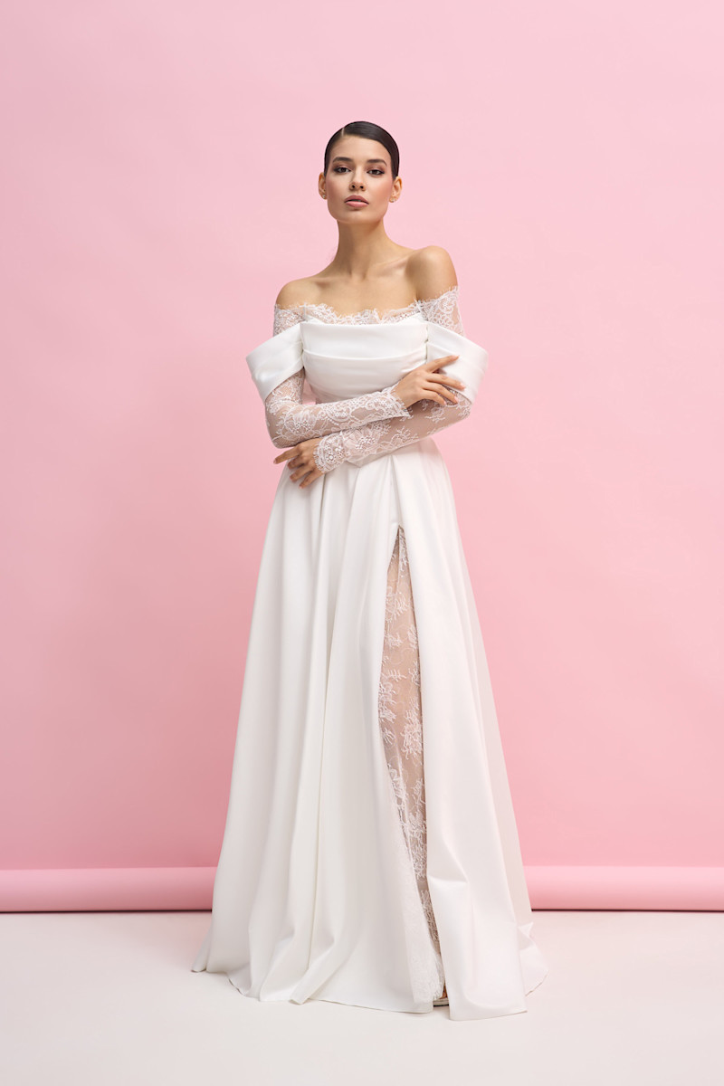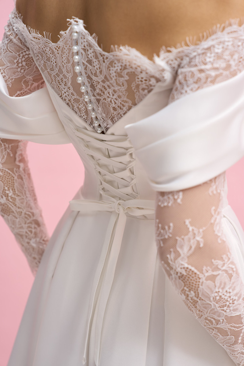 Модель А-силуэта из атласа ,с рукавами и вставками из кружева .С безупречной посадкой по фигуре